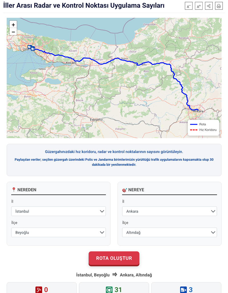 Örnek olarak, İstanbul Beyoğlu’ndan Ankara Altındağ’a oluşturulan bir rotada sürücüler 3 radar noktası, 29 kontrol noktası ve 3 hız koridoru bilgisine erişebiliyor.
