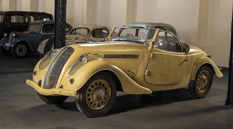 Bir diğer dikkat çekici model olan Popular Roadster Deluxe, çarpıcı Monte Carlo gövdesi ve mavi-gri metalik rengiyle sergide özgün haliyle yer alıyor. 1936 Prag Otomobil Fuarı için özel olarak üretilen bu otomobilin kaputunda, o dönemin izleri hâlâ görülebiliyor.